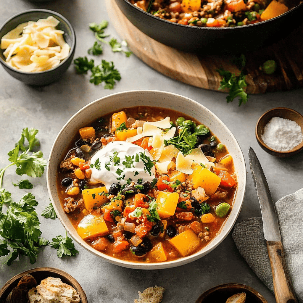 This chunky autumn vegetable soup is a cozy, nourishing bowl filled with seasonal vegetables, simmered in fragrant broth, and seasoned with herbs. It’s comforting, naturally gluten-free, freezer-friendly, and easily adaptable to vegan or protein-packed versions—perfect for fall dinners or healthy meal prep.