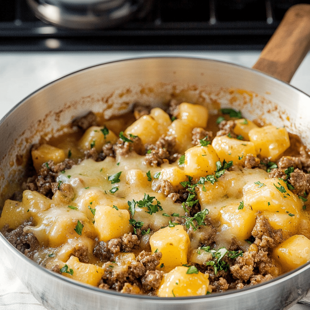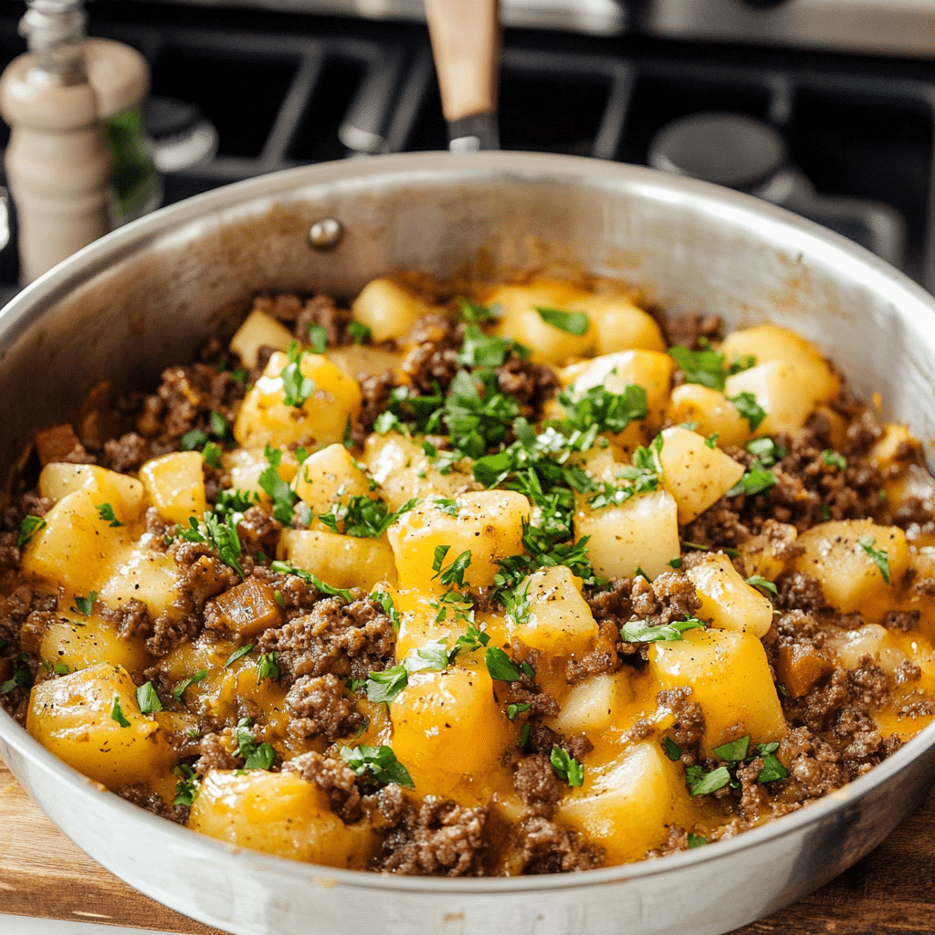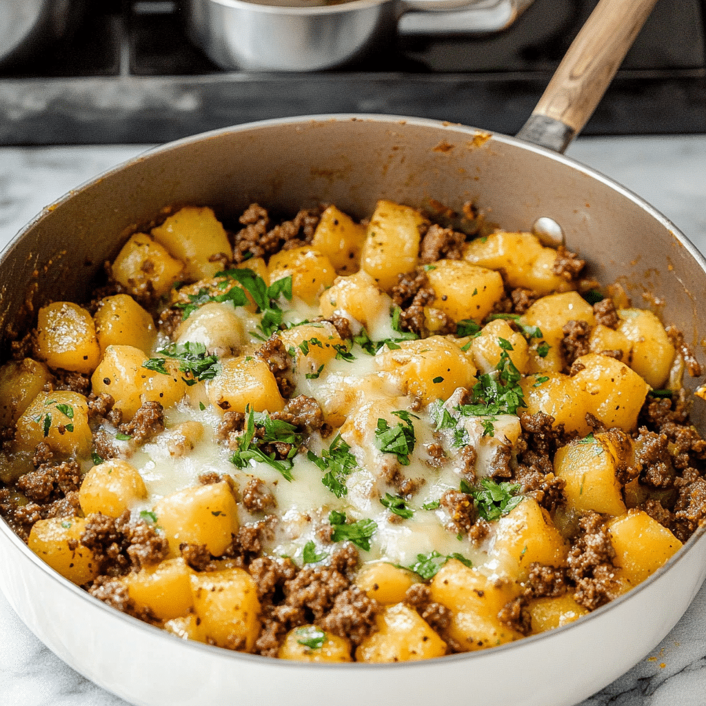This cheesy beef and potatoes skillet is the ultimate comfort food — hearty ground beef, golden potatoes, and melty cheddar cheese cooked in one pan. Perfect for busy weeknights, this beef dinner is quick, satisfying, and packed with flavor. One of the best ground beef recipes for families and anyone who loves simple beef dishes.