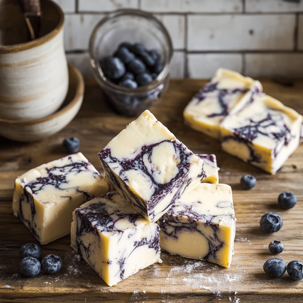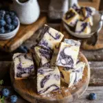 - Layer Fudge: Line an 8×8-inch dish with parchment. Pour half the fudge mixture, add blueberry sauce, and swirl. Add remaining fudge and swirl again with more blueberry sauce.