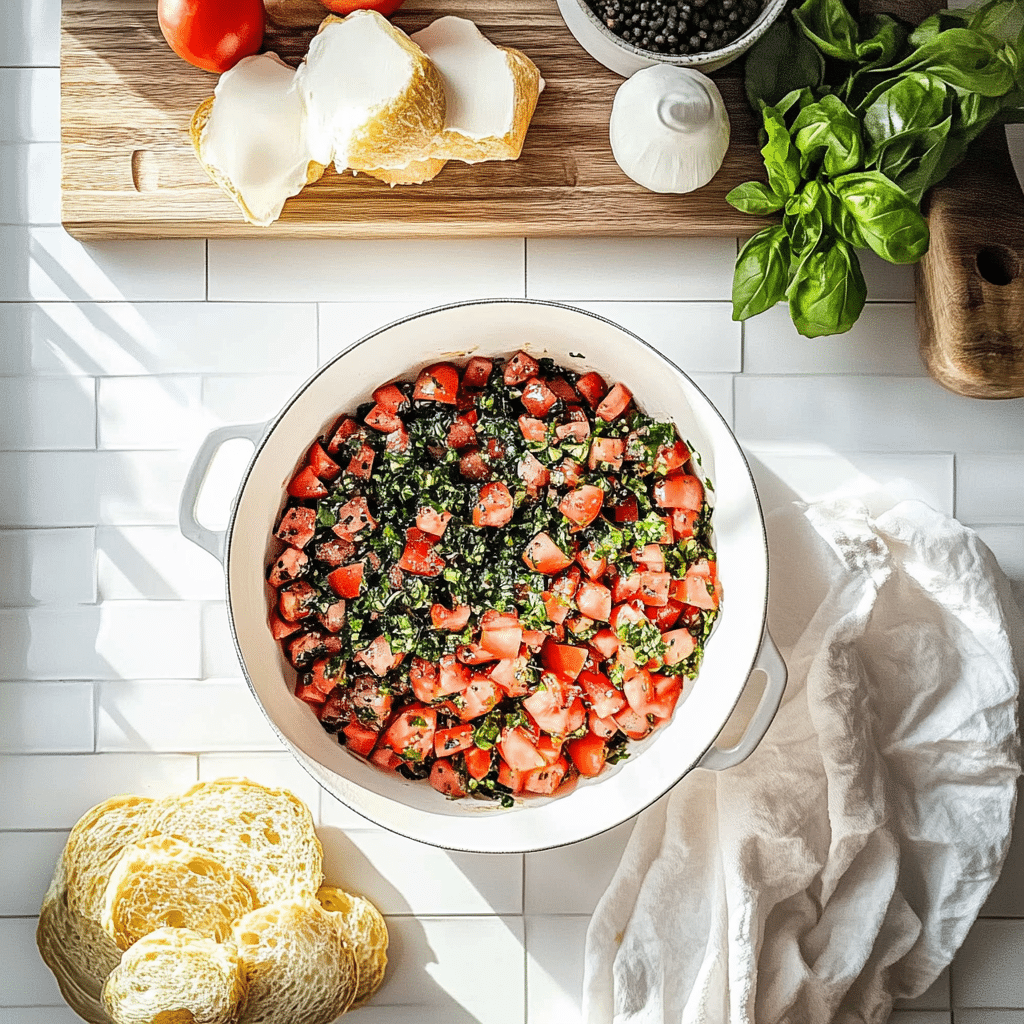- Prepare Tomato Mix: Dice tomatoes and place in mixing bowl. Add olive oil, minced garlic, basil, salt, and pepper. Stir and let sit 10–15 minutes to meld flavors.