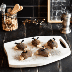 Halloween is all about atmosphere, and that extends to the food you serve. From chocolate bat treats to candy-coated monster desserts, everything should feel fun, playful, and a little eerie. These chocolate-covered strawberries are dressed up for the occasion with melted chocolate “fur,” almond “ears,” and candy “eyes” to bring them to life. Not only do they look adorable (and slightly creepy), but they’re also bite-sized, making them ideal for kids and adults alike. You can place them on a festive platter alongside other creepy Halloween food items, like strawberry crunch cheesecake cones or pumpkin-shaped sandwiches, to create a themed dessert buffet.