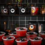While the basic red jello shot recipe Halloween style uses cherry or strawberry Jell-O, you can go bolder. Mix in a swirl of raspberry puree for a more realistic “bloody” look, or add gummy worms inside the cups for an extra spooky surprise.
