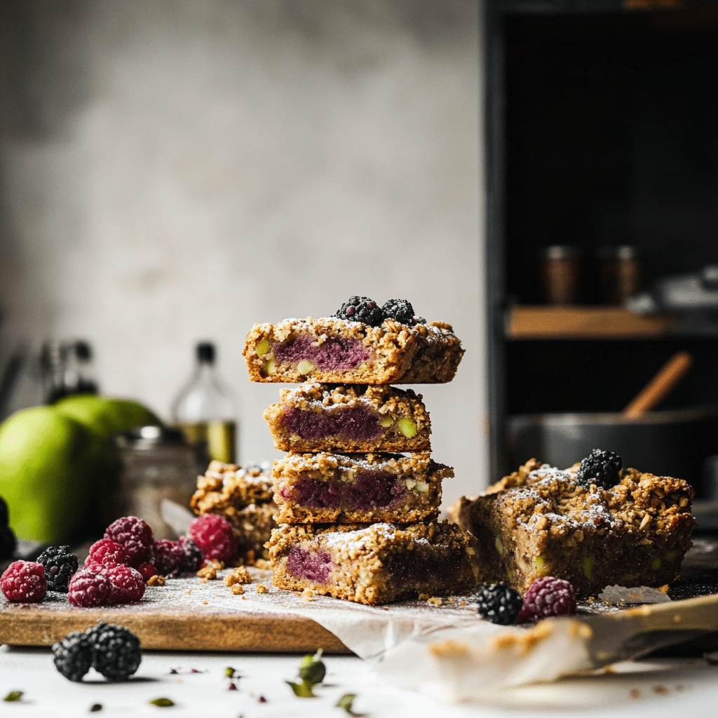 These fruit bar desserts are proof that you can create something exquisite with simple ingredients and minimal effort. With vibrant blackberries, crunchy pistachios, and a hint of lemon and herbs, they offer a refreshing twist on classic crumble bars—perfect for impressing guests at any gathering or brightening up a regular day.