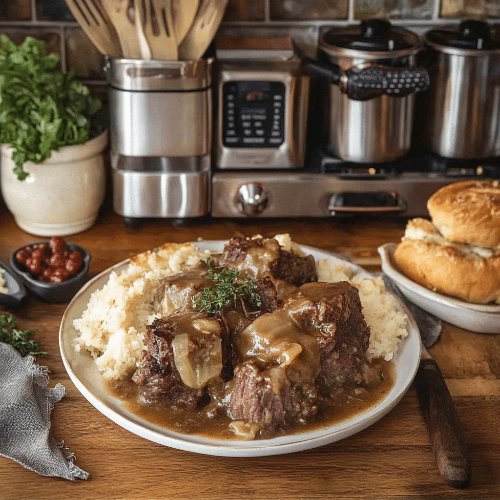 If you’d like a thicker gravy, remove the roast and set the Instant Pot to sauté mode. Mix cornstarch with water to form a slurry, then whisk into the onion sauce until thickened.