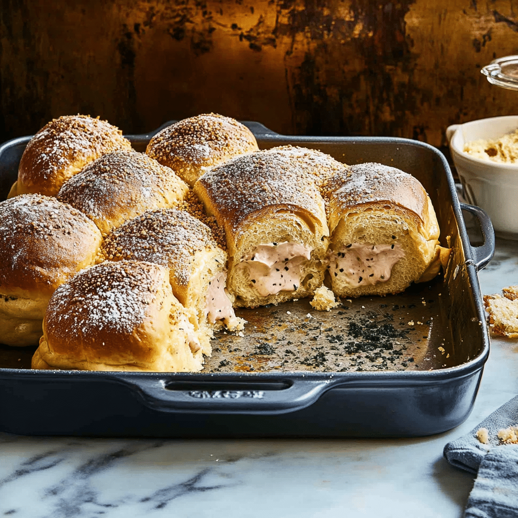 - Slice the rolls in half horizontally and place the bottom halves in the prepared dish.