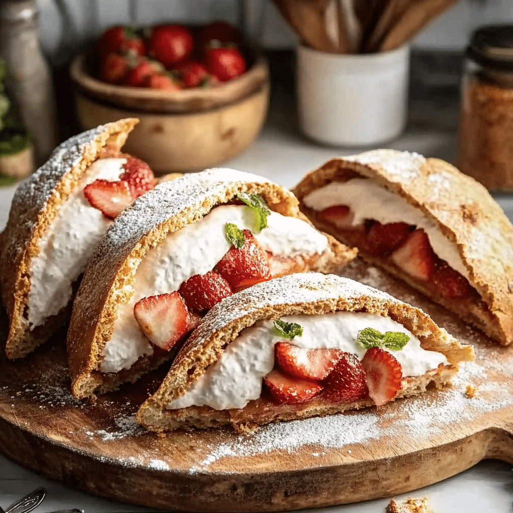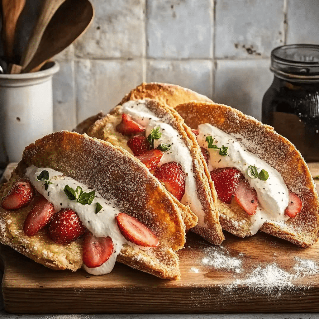 - Assemble tacos: Pipe cheesecake filling into cooled taco shells. Top with diced strawberries, sprinkle cookie-strawberry crumble, and drizzle with strawberry syrup if desired.
