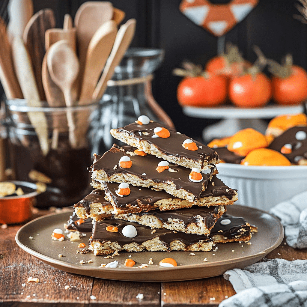 Preheat your oven to 350°F (175°C) and line a rimmed baking sheet with parchment paper. Arrange the saltine crackers in a single layer to cover the sheet. In a saucepan, melt the butter and brown sugar together over medium heat, stirring constantly, until it comes to a boil. Let it boil for 2–3 minutes. Pour the caramel evenly over the crackers and spread it with a spatula. Bake for 5 minutes. Remove from oven and sprinkle chocolate chips over the hot caramel layer. Let them melt for 2–3 minutes, then spread evenly. Sprinkle with your chosen Halloween candy while the chocolate is still soft. Let it cool completely before cutting into squares.