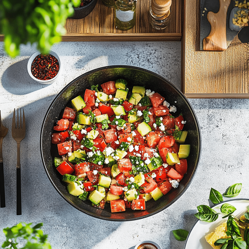 The magic of watermelon feta salad lies in its simplicity. You don’t need complicated ingredients or techniques — just fresh produce and a few pantry staples. The sweet watermelon cuts through the briny feta, while cucumber slices add a crisp, cooling texture. The drizzle of olive oil and a touch of lemon juice tie everything together, making it a light yet flavorful side dish.