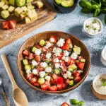 Watermelon cucumber feta salad is a colorful, refreshing mix of sweet watermelon, crisp cucumber, and tangy feta, finished with fresh mint and a light lemon-olive oil dressing. Perfect for summer BBQs, Mediterranean-inspired meals, or elegant party cups, it’s a quick, healthy side dish that’s as beautiful as it is delicious.