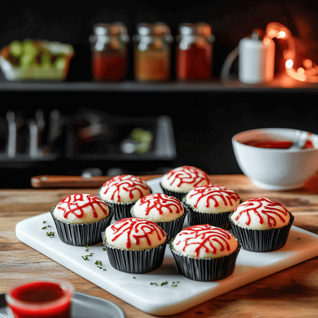 For kids’ parties, keep the designs playful—think pastel pink frosting brains with candy eyeballs. For adults, lean into the gory cupcakes by adding jam, dark food coloring, and realistic details.